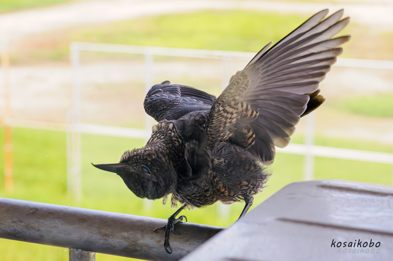 ところが一昨日からイソヒヨドリが室外機の周辺に飛んで来るようになりました。もしかしてと思い以前のように鉢置きを室外機の上に置いていると水浴びを始めました。この場所を覚えているのは一昨年に来ていたイソヒヨドリじゃないかと思います。雌雄も以前と同じ雌です。