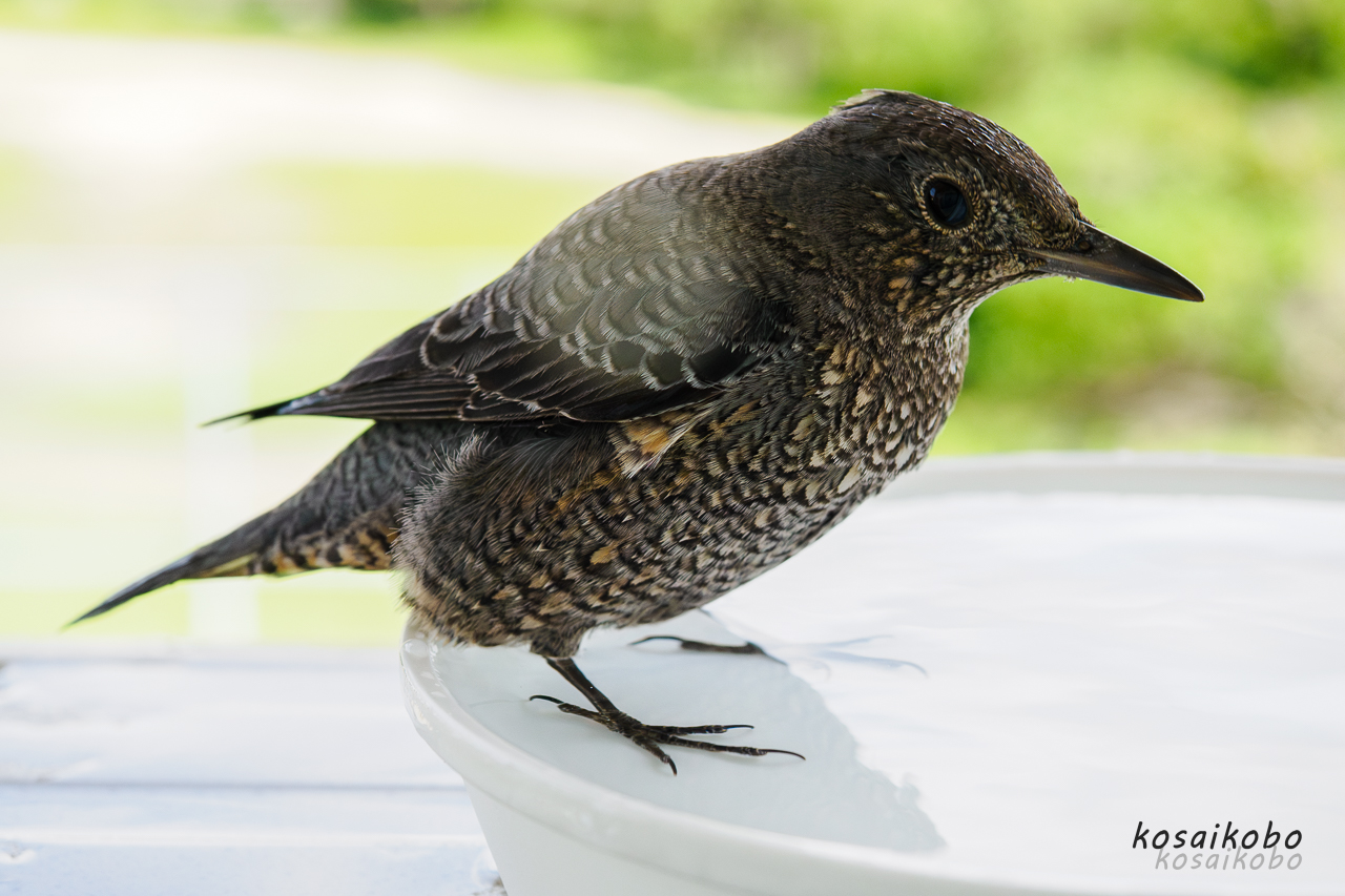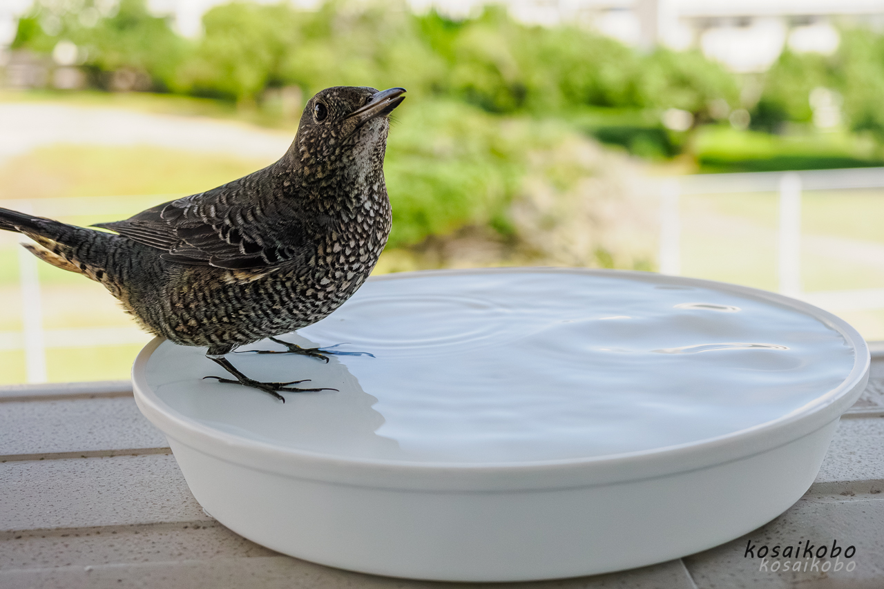 そこで排水受けの代わりにイソヒヨドリの全身が入る大きさの鉢置きの中に水を入れてやると毎日やって来てはこの中で水浴びをするようになりました。