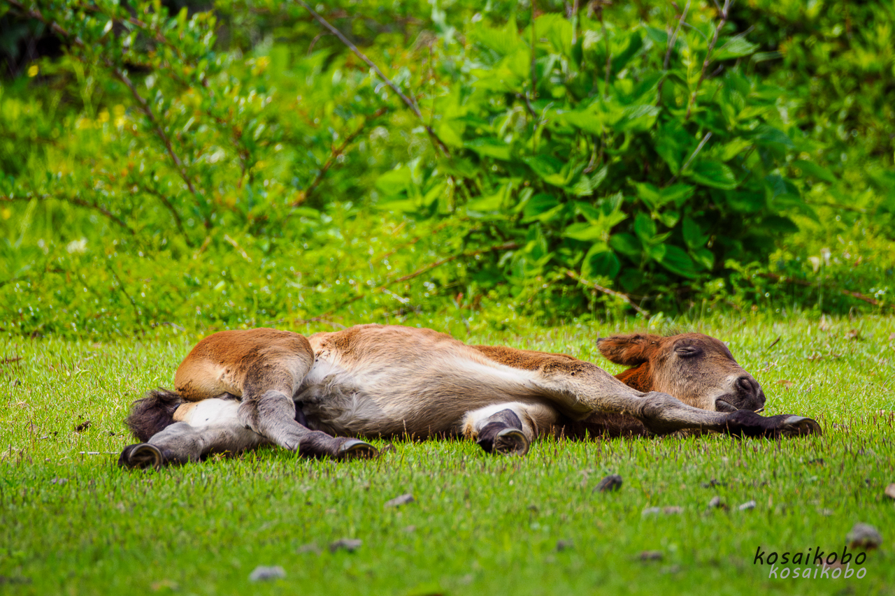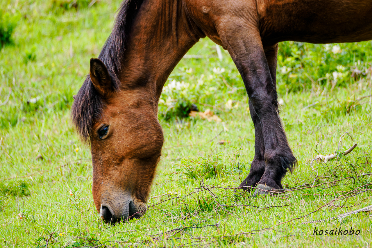 岬は、野生馬の出産シーズンのようで、子供を連れた母馬が目立ちました。ここも記憶風景が様変わり。いざ自分で運転して来てみると、岬の標高の高さにびっくりしました。青森県尻屋崎の寒立馬は、海とほぼ同じ高さでしたが、都井岬は山の斜面に生息している感じが正しいのじゃないでしょうか。野生馬たちの姿を撮影しようと意気込んで行きましたが斜面の傾斜が厳しく年寄りの出番のない撮影シーンと感じ撮影を程々に切り上げました。