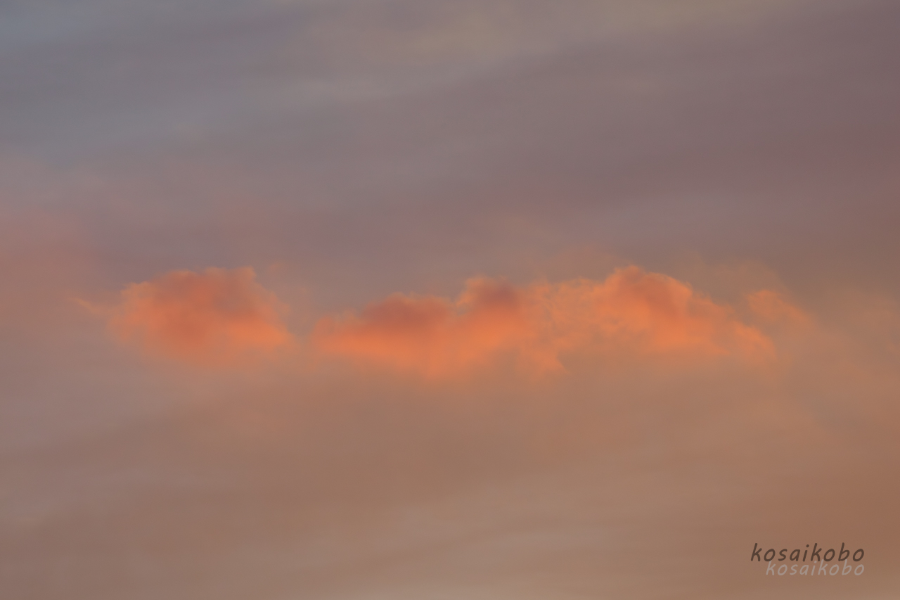 今朝の日の出は、残念ながら水平線近くを厚い雲がおおい太陽の一部しか見えませんでした。一方、空の多くは、筋雲がおおい朝焼けを反射して綺麗でした。そこで朝日を反射して淡く輝く茜雲を撮影してみました。